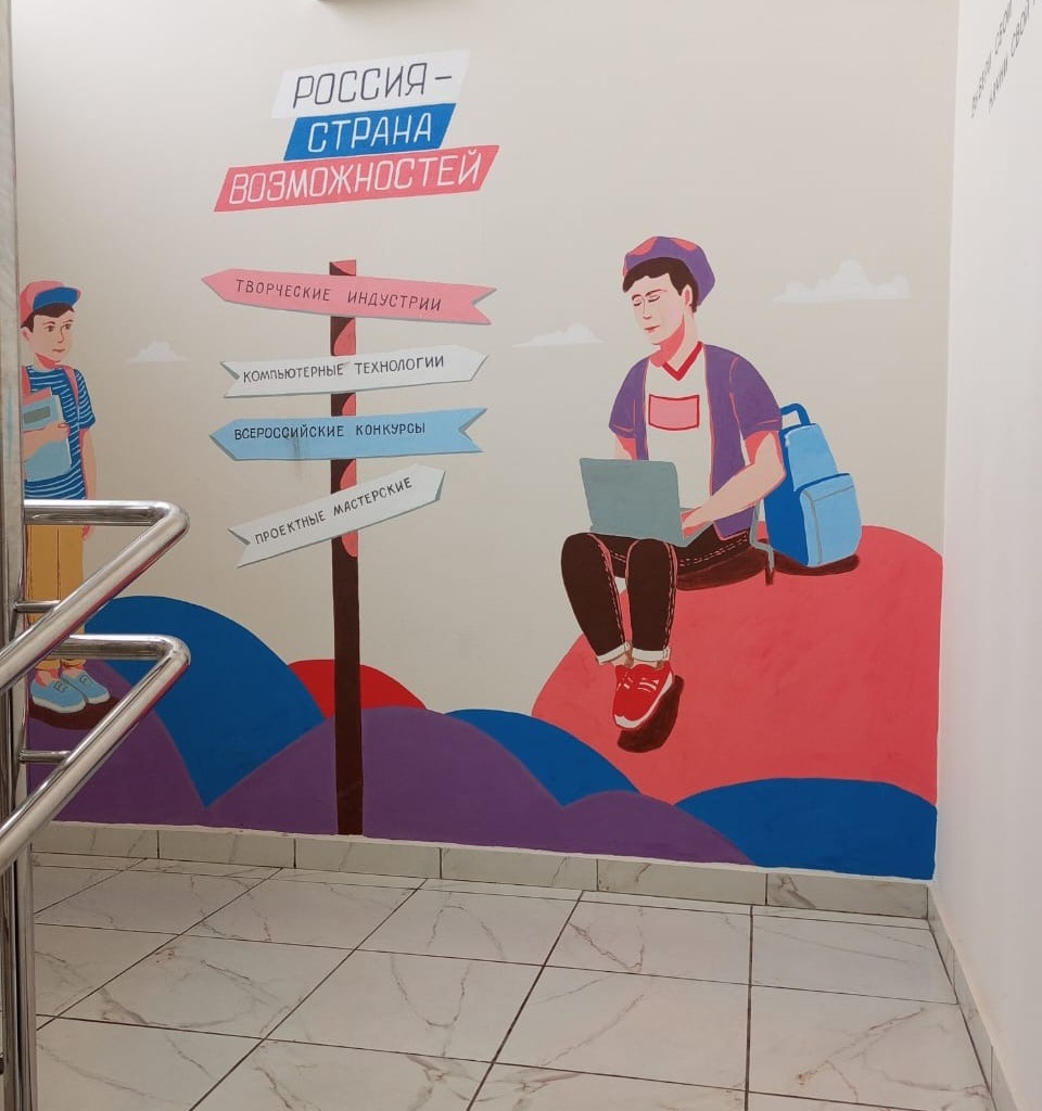 Тематика панно охватывает историю России, патриотическое воспитание, движение «Орлята России» и многое другое. Всего оформлено 8 пространств на трёх этажах, включая композиции с 3D-эффектом.